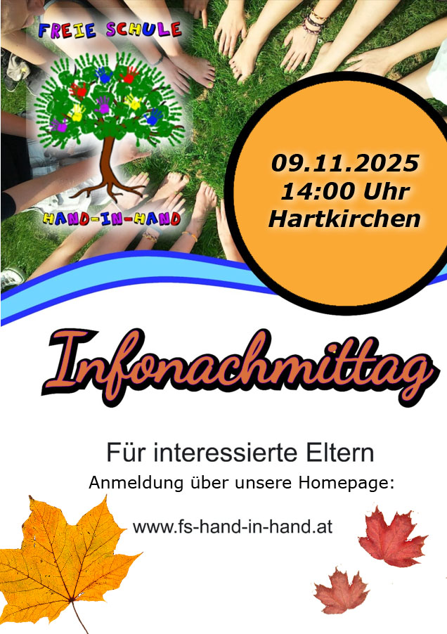 Um noch in diesem Jahr den interessierten Eltern einen Infonachmittag bieten zu können, wird ein zusätzlicher Termin organisiert. Dieser findet in Hartkirchen in der Freien Schule am Samstag, den 9.11.2025, um 14 Uhr statt. Bitte gerne die tolle Möglichkeit nutzen und gleich hier anmelden.