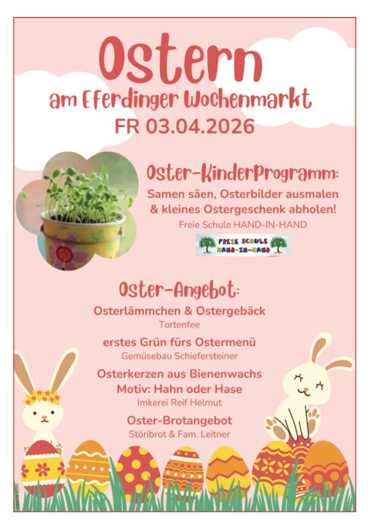 Am Karfreitag 03. April 2026 sind wir am Wochenmarkt Eferding mit einem Oster-Kinderprogramm vertreten. Kommt vorbei und bastelt mit uns.